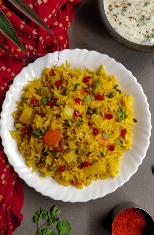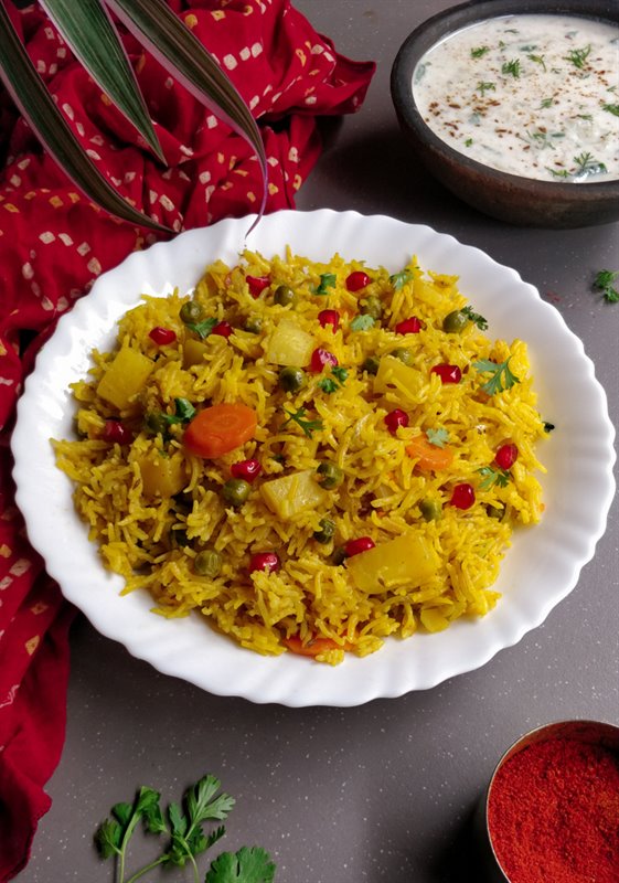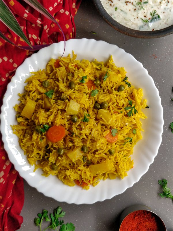 Aloo Matar ki Tahari makes for a great dinner. It is a complete meal in itself. Serve it along with kachumber salad, raita and papad.